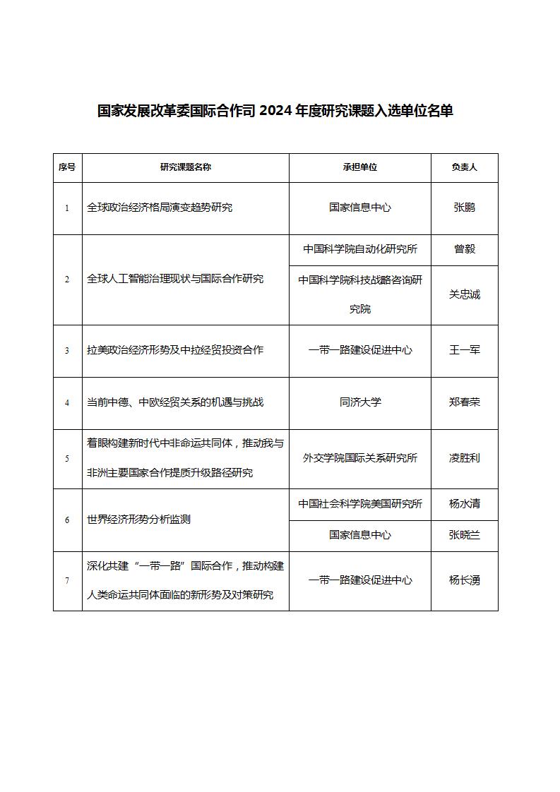 国家发改委国际合作司关于2024年度研究课题入选单位的公告