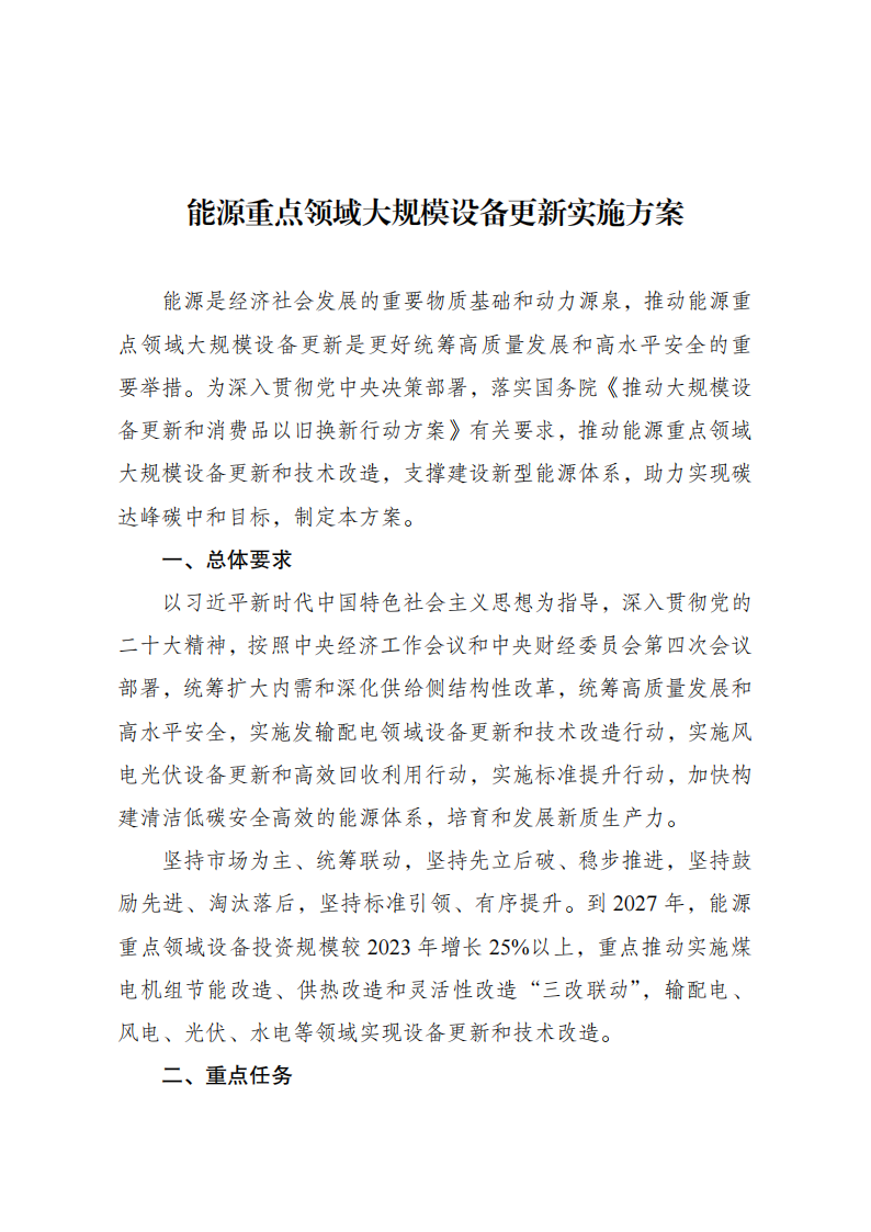 国家发改委 国家能源局联合印发《能源重点领域大规模设备更新实施方案》
