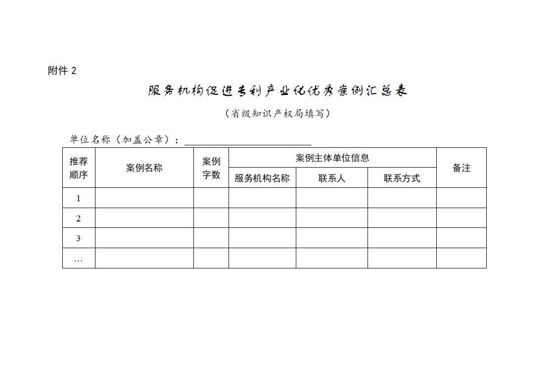 (二)请各省级知识产权局于2024年8月23日前将报送材料(电子版)发至邮箱zhyy@cnipa.gov.cn。报送材料包括案例汇总表(电子版和加盖公章后的PDF扫描件,见附件2)和全部案例文件,请汇总在一个压缩包内,邮件标题和压缩包按照“服务机构促进专利产业化优秀案例报送(地名)”命名。