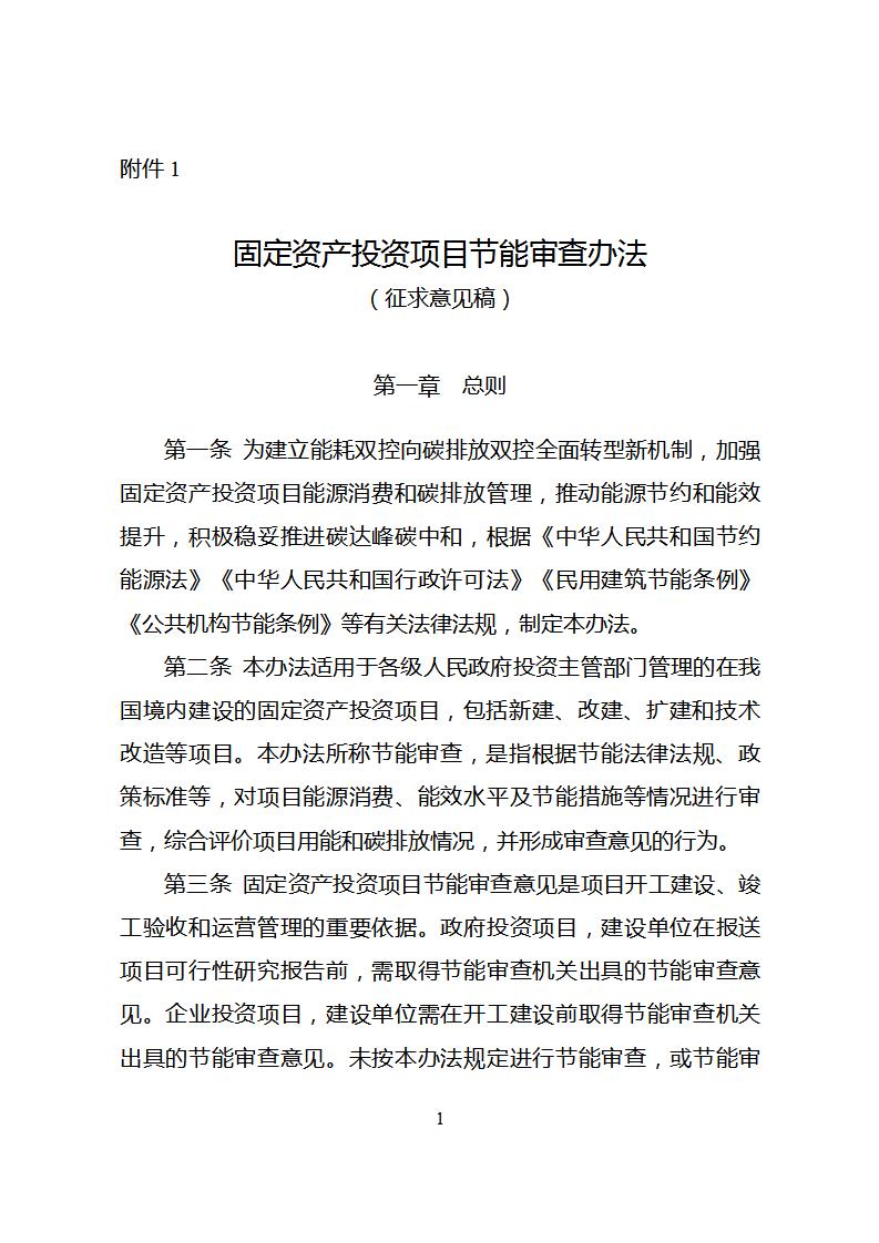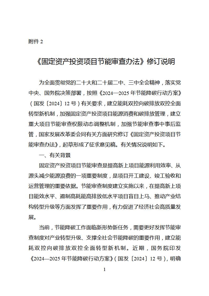 为全面贯彻党的二十大和二十届二中、三中全会精神,建立能耗双控向碳排放双控全面转型新机制,加强固定资产投资项目能源消费和碳排放管理,推动能源节约和能效提升,积极稳妥推进碳达峰碳中和,国家发展改革委会同有关方面在深入开展调研、广泛听取意见的基础上,修订形成了《固定资产投资项目节能审查办法(征求意见稿)》,现向社会公开征求意见。