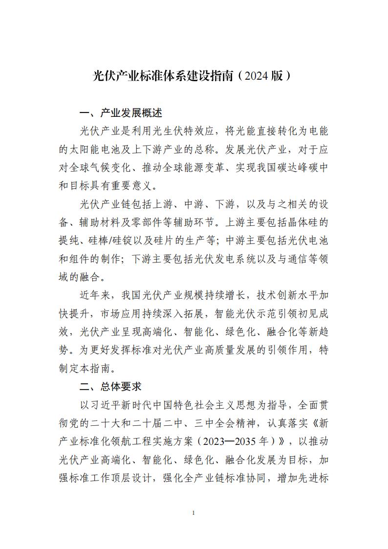 为认真落实《新产业标准化领航工程实施方案(2023—2035年)》,加强光伏产业标准工作顶层设计,我们组织编制了《光伏产业标准体系建设指南(2024版)》。现印发给你们,请结合实际,抓好贯彻落实。