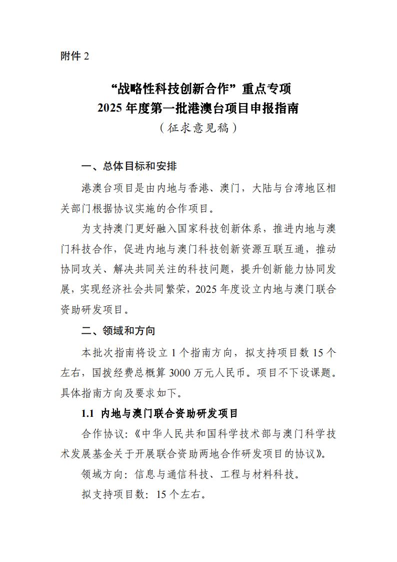 现将国家重点研发计划“政府间国际科技创新合作”重点专项和“战略性科技创新合作”重点专项2025年度有关批次项目申报指南(见附件)向社会征求意见。征求意见时间为2024年9月27日至2024年10月9日,请于10月9日24点之前发送至电子邮箱:liuh@most.cn。