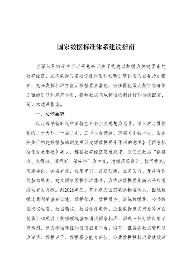 为深入学习贯彻党的二十大和二十届二中、三中全会精神,落实《中共中央、国务院关于构建数据基础制度更好发挥数据要素作用的意见》要求,充分发挥标准在激活数据要素潜能、做强做优做大数字经济等方面的规范和引领作用,国家发展改革委、国家数据局、中央网信办、工业和信息化部、财政部、国家标准委组织编制了《国家数据标准体系建设指南》。现印发给你们,请各地区、各行业结合实际,抓好落实。