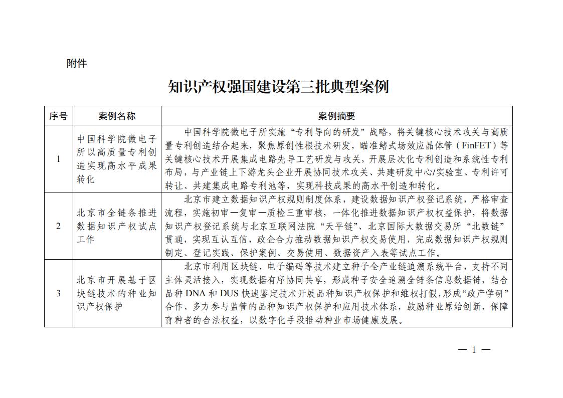为深入贯彻落实《知识产权强国建设纲要(2021—2035年)》和《“十四五”国家知识产权保护和运用规划》,总结提炼各地区在推进知识产权强国建设中的经验做法,发挥典型示范引领作用,国家知识产权强国建设工作部际联席会议办公室从全国范围内选取了30个创新性强、成效较为突出、具备复制推广价值的案例,作为知识产权强国建设第三批典型案例。现印送给你们,供各地区、各部门在推进知识产权强国建设工作中综合借鉴。