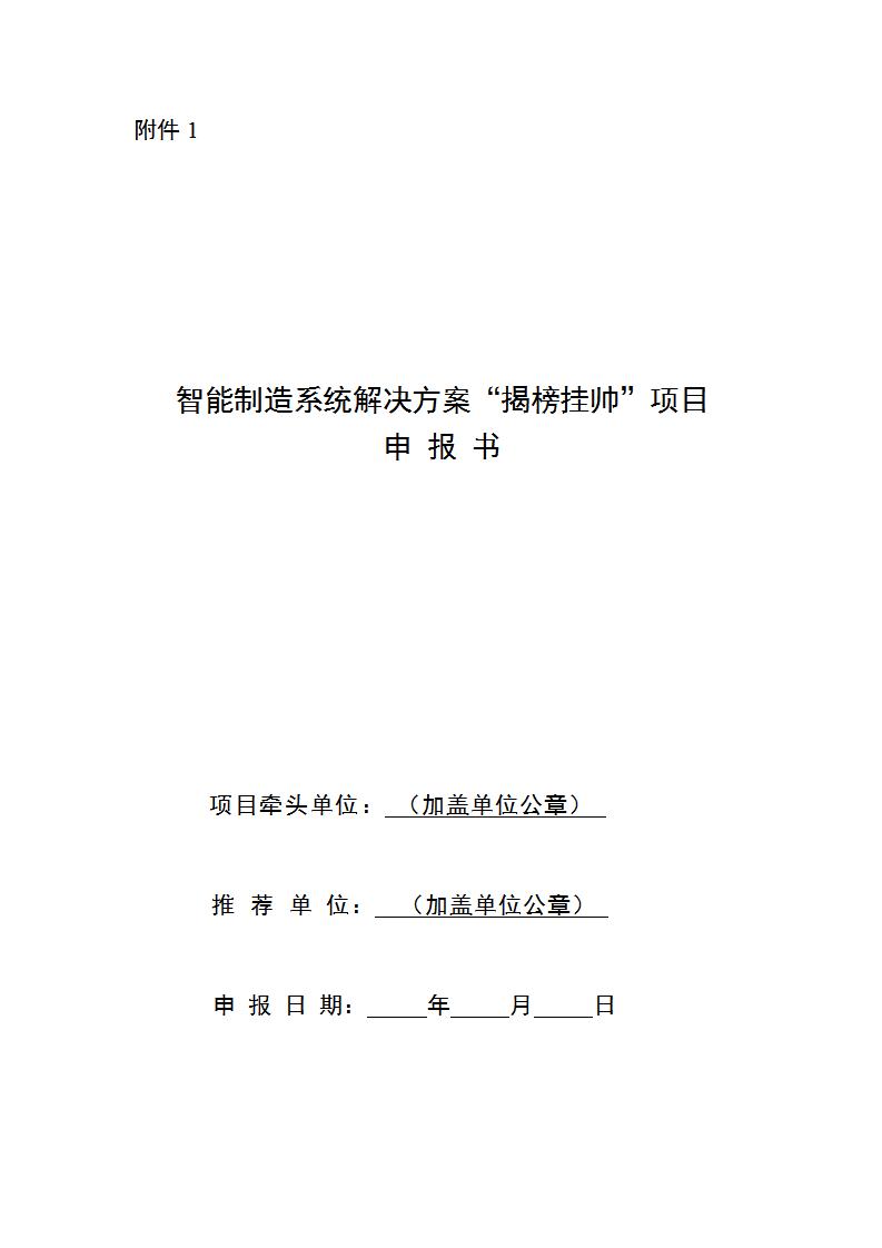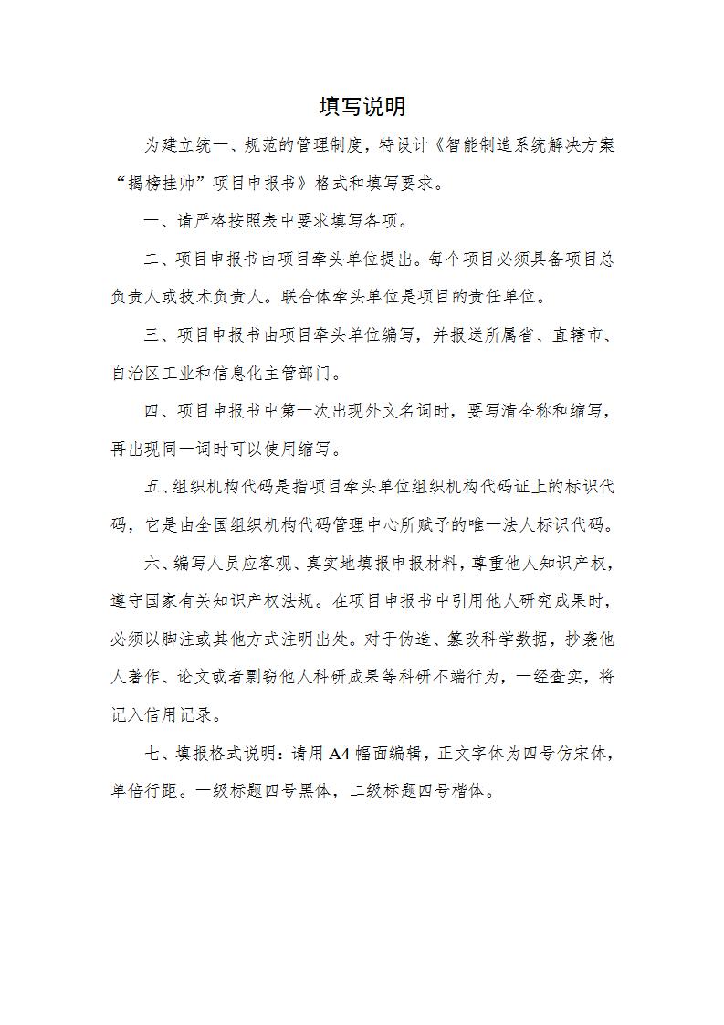 (一)申报单位可结合自身实际编制《智能制造系统解决方案“揭榜挂帅”项目申报书》(附件1),明确智能制造系统解决方案产品和服务揭榜任务,于2024年11月13日前完成线上申报。申报单位应对申报内容的真实性负责,确保申报材料不涉及国家秘密、商业秘密。
