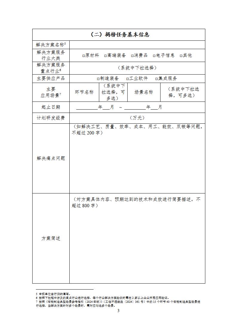 (二)每个申报单位可牵头申报1个项目,最多可涵盖3个智能制造系统解决方案揭榜任务。揭榜任务应聚焦某一具体行业(附件2)、围绕智能制造典型场景(详见《智能制造典型场景参考指引(2024年版)》)开展集成攻关和应用验证。