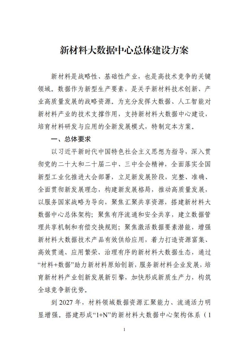 工业和信息化部 财政部 国家数据局关于印发《新材料大数据中心总体建设方案》的通知