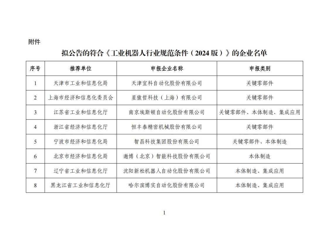 拟公告的符合《工业机器人行业规范条件(2024版)》的企业名单