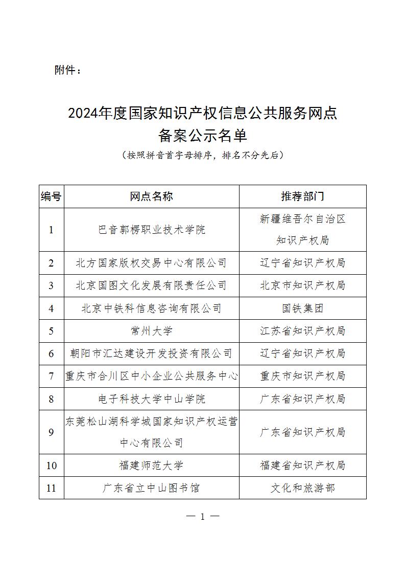 为贯彻落实习近平总书记关于“要形成便民利民的知识产权公共服务体系”的重要指示精神,按照国家知识产权局统一工作安排,根据《国家知识产权信息公共服务网点备案实施办法(修订)》要求,统筹考虑基本条件、地区分布、机构类型、服务效能等因素,国家知识产权局拟备案36家机构为国家知识产权信息公共服务网点。根据备案工作程序,现将2024年度国家知识产权信息公共服务网点备案名单予以公示。