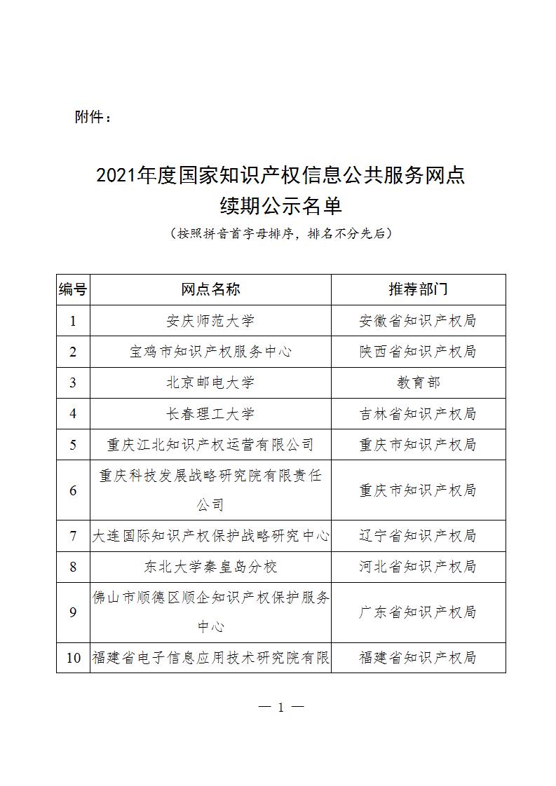 国家知识产权局|2021年度国家知识产权信息公共服务网点续期名单公示