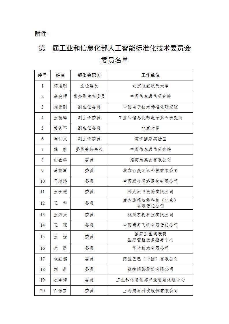 工信部|第一届工业和信息化部人工智能标准化技术委员会委员名单公布