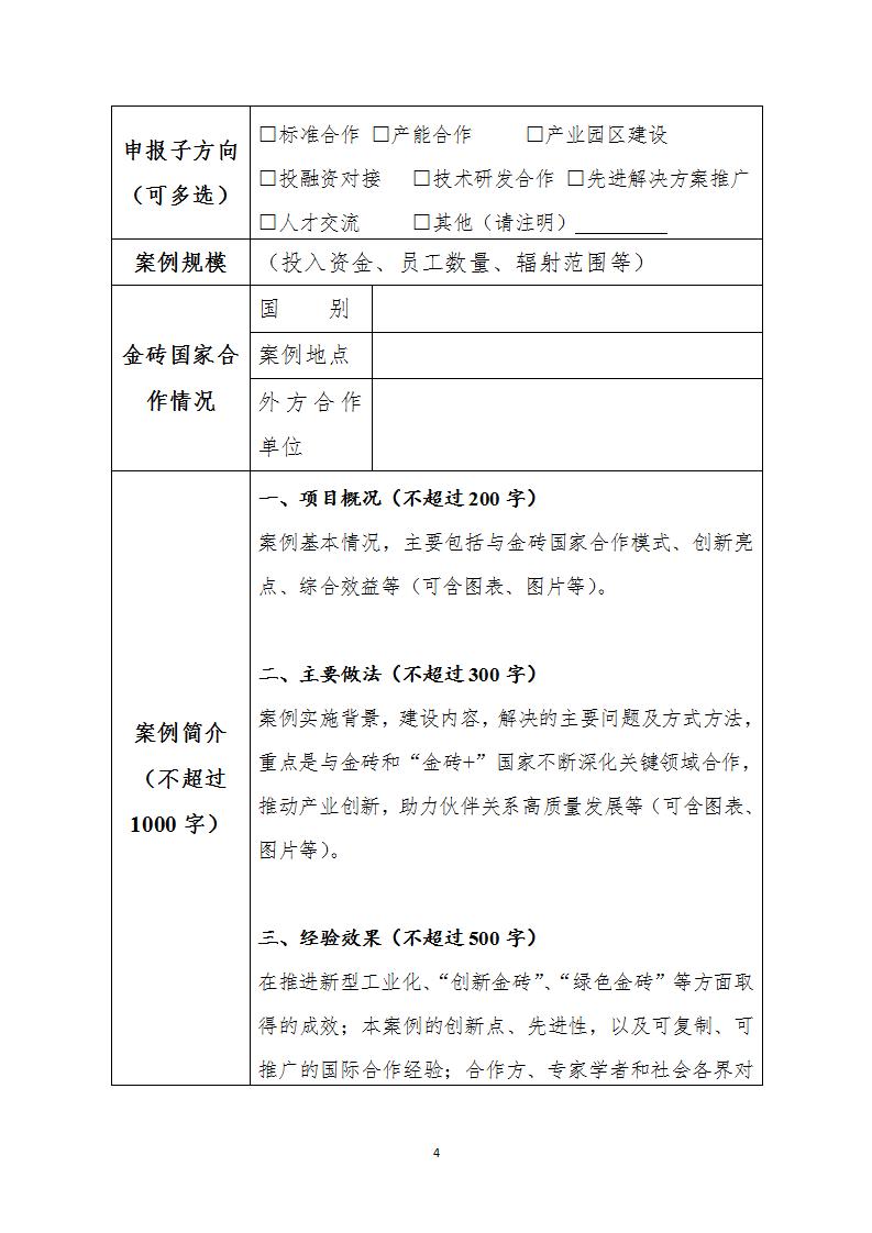 (三)案例应符合我对外合作总体战略方向和政策导向,体现开放包容、合作共赢的金砖精神,突出供需对接、产业升级、结构优化、模式创新等方面实践和成效。