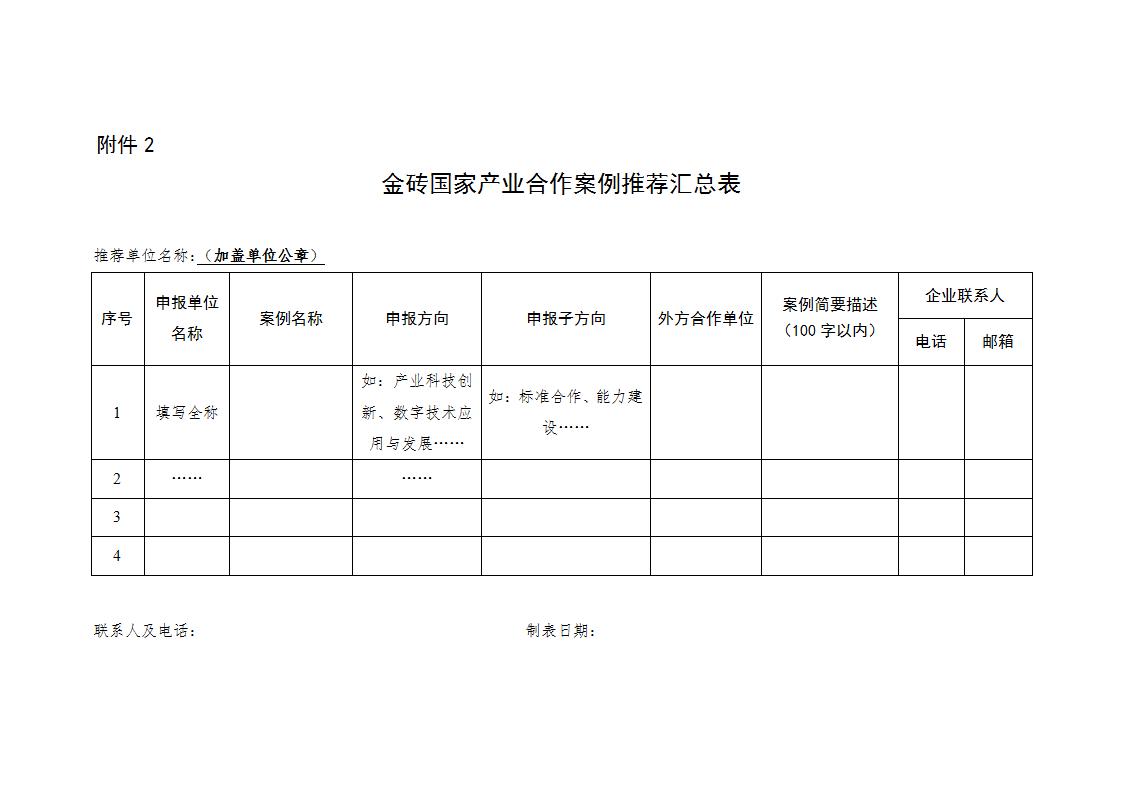 (二)推荐单位负责组织填写《金砖国家产业合作案例申报书》(附件1,如有图表、图片、视频等有助于更好宣介案例的资料可一并提供)、《金砖国家产业合作案例推荐汇总表》(附件2),审核后于2025年4月25日前报送工业和信息化部(国际合作司),电子版发送至dic@cietc.org.cn。