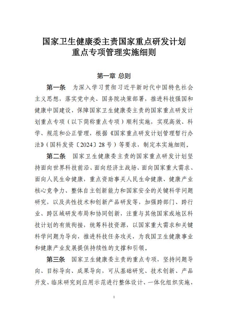 为规范国家卫生健康委主责国家重点研发计划重点专项管理,保障专项组织实施,根据党中央、国务院关于国家科技计划管理改革的有关要求,按照科技部、财政部《国家重点研发计划管理暂行办法》(国科发资〔2024〕28号),现将《国家卫生健康委主责国家重点研发计划重点专项管理实施细则》印发给你们,请遵照执行。