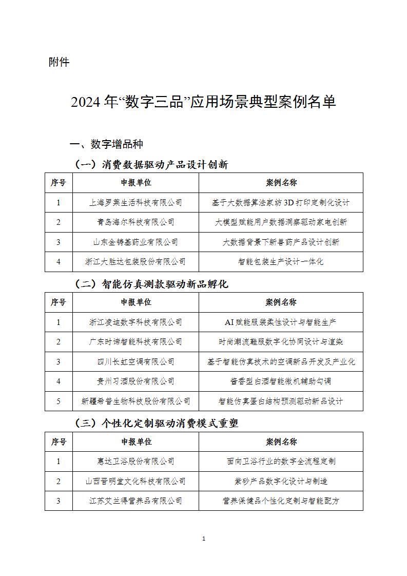 为全面贯彻党的二十届三中全会精神,加快落实全国新型工业化推进大会工作部署,根据《工业和信息化部办公厅关于分级打造中国消费名品方阵的通知》(工信厅消费函〔2024〕369号),经企业申报、省级工业和信息化主管部门初审推荐、专家评审和网上公示,我部确定了2024年“数字三品”应用场景典型案例名单,现予以公布。