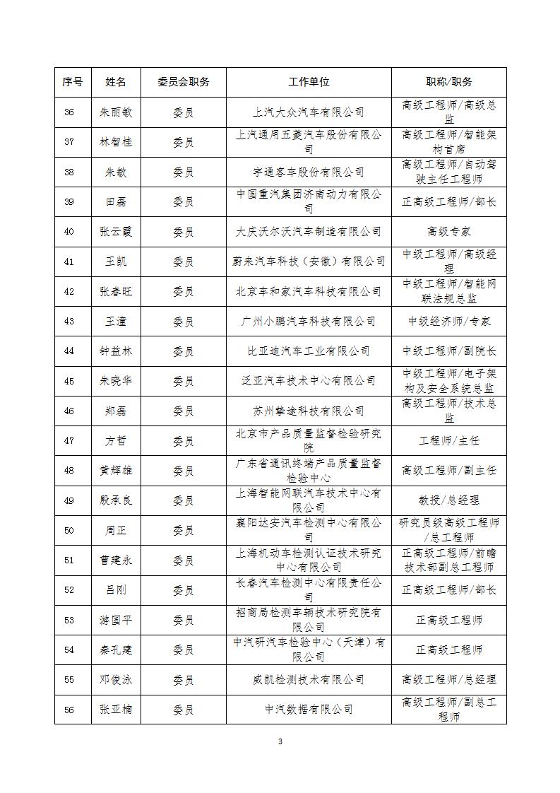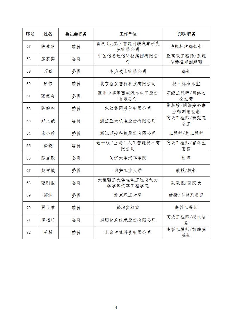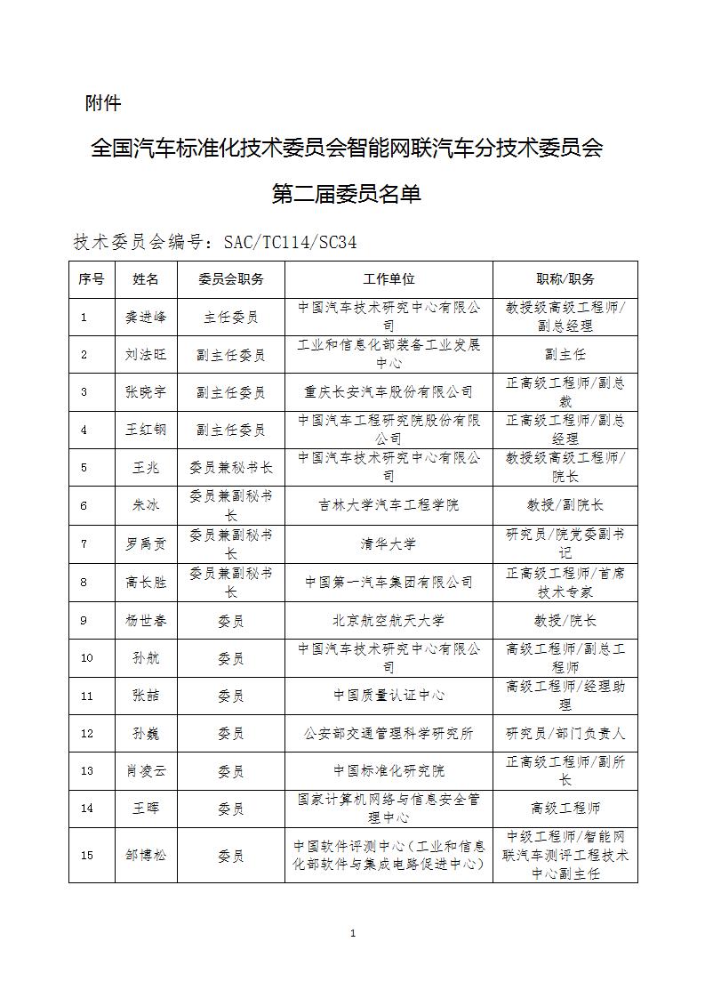 全国汽车标准化技术委员会智能网联汽车分技术委员会第二届委员名单公示