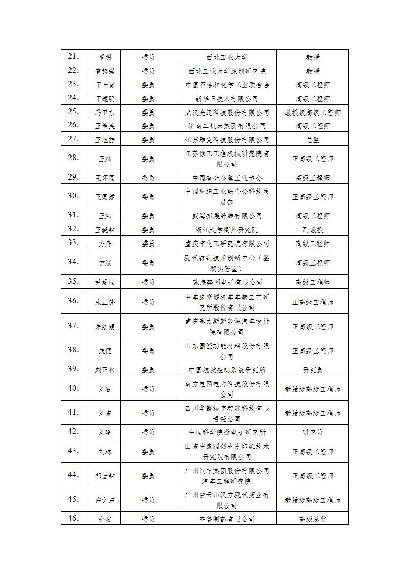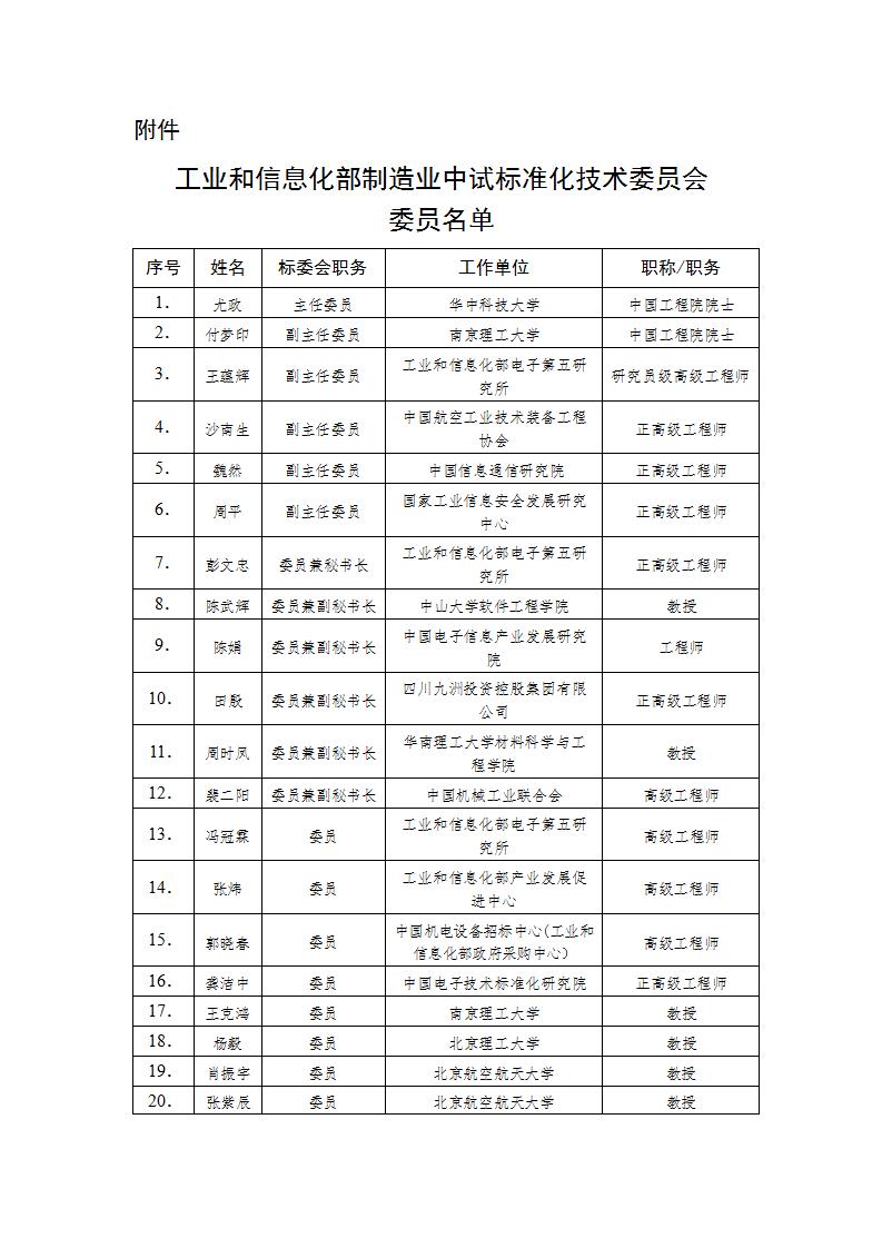 工业和信息化部制造业中试标准化技术委员会委员名单公示