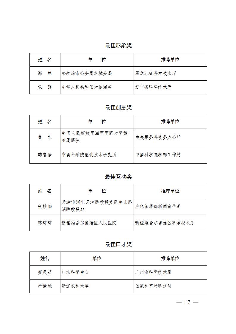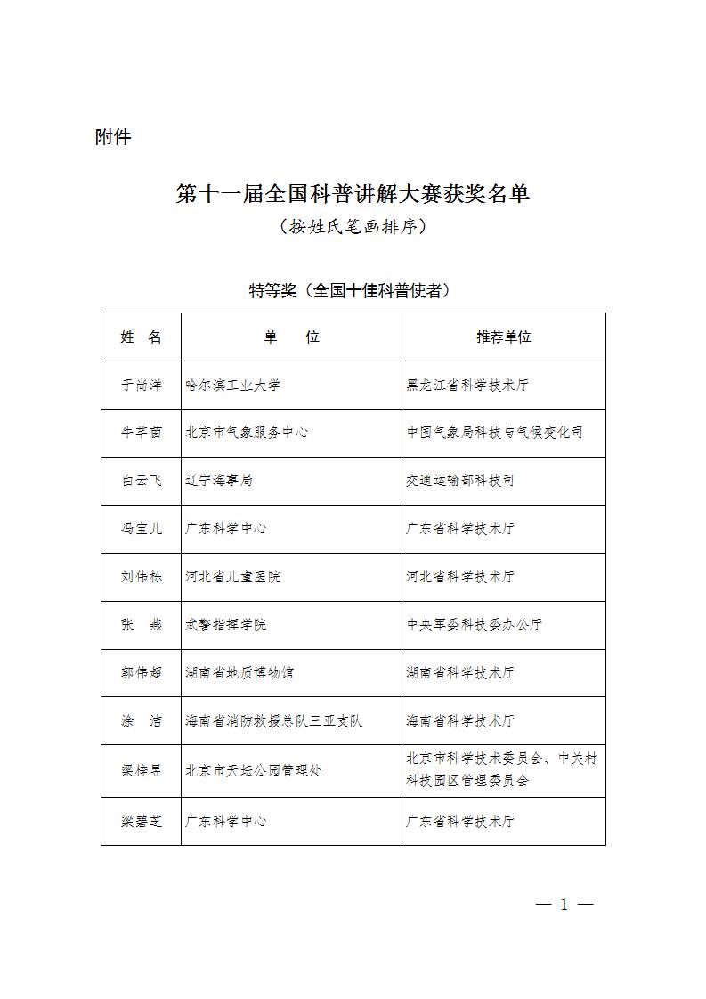 科技部办公厅关于公布第十一届全国科普讲解大赛获奖名单的通知