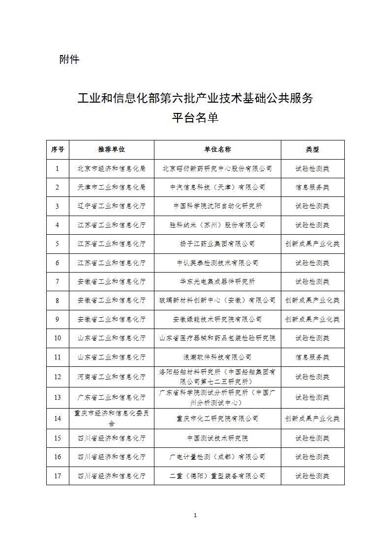 工业和信息化部关于公布第六批产业技术基础公共服务平台名单的通知