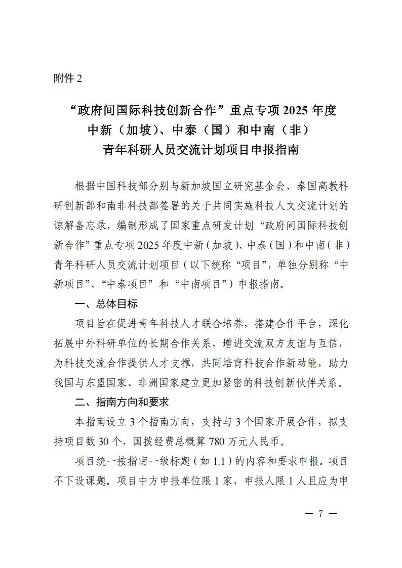 科技部国际合作司关于发布国家重点研发计划“政府间国际科技创新合作”重点专项2025年度中新(加坡)、中泰(国)和中南(非)青年科研人员交流计划项目申报指南的通知