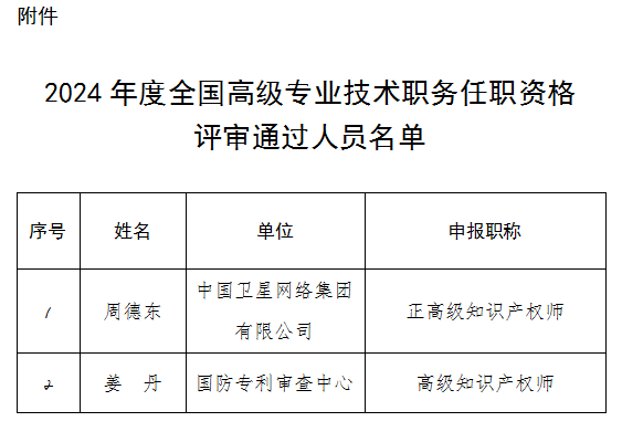 国家知识产权局|2024年度全国高级专业技术职务任职资格评审结果公示