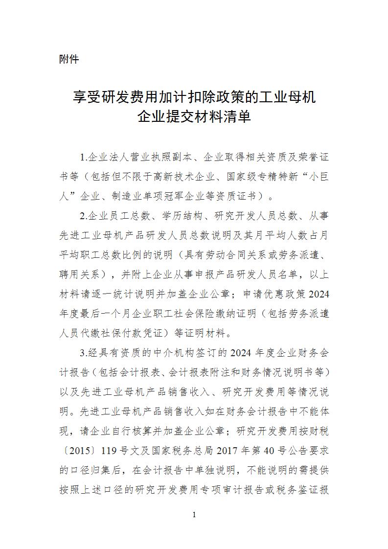 二、申请列入清单的企业应于2025年3月31日前登录系统(www.gymjtax.com),选择“工业母机企业研发费用加计扣除政策申报入口”提交申请,并生成纸质文件加盖企业公章,连同必要佐证材料(电子版、纸质版)报各省、自治区、直辖市及计划单列市、新疆生产建设兵团工业和信息化主管部门(以下称地方工信部门)。已列入2023年清单的企业,拟继续申请进入2024年清单的,须重新提交《享受研发费用加计扣除政策的工业母机企业提交材料清单》(见附件)中第2、3、6、8项,其余项若有变化请一并提交。