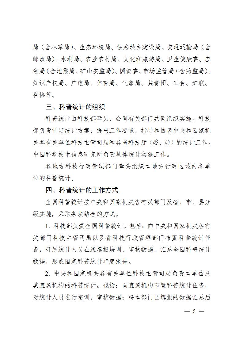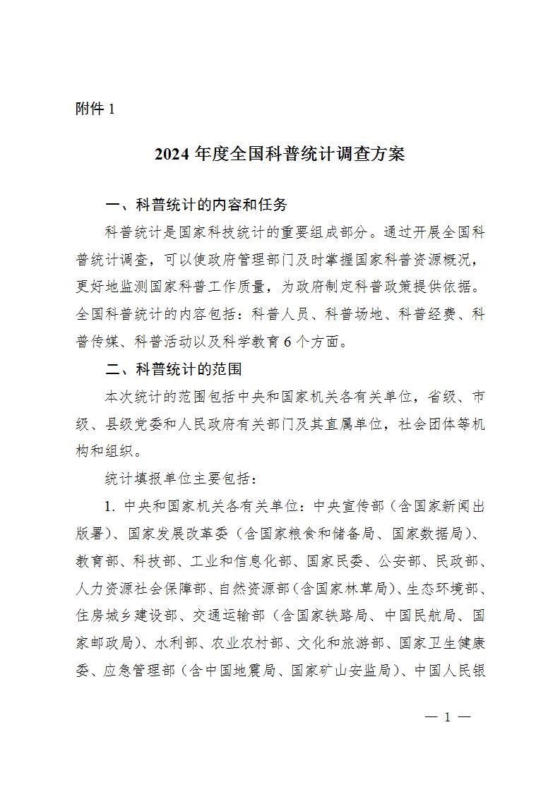科普统计是支撑服务科普管理的重要基础性工作。根据《国家统计局关于批准执行〈全国科普统计调查制度〉等7项统计调查制度的函》(国统制〔2025〕36号)要求,按照《科学技术部科技统计工作管理办法》(国科发规〔2018〕272号)、《科技部关于开展2024年度科技统计调查工作的通知》(国科函规〔2025〕22号)相关规定,决定启动实施2024年度全国科普统计调查工作,并制定《2024年度全国科普统计调查方案》(附件1)。现将有关事项通知如下。