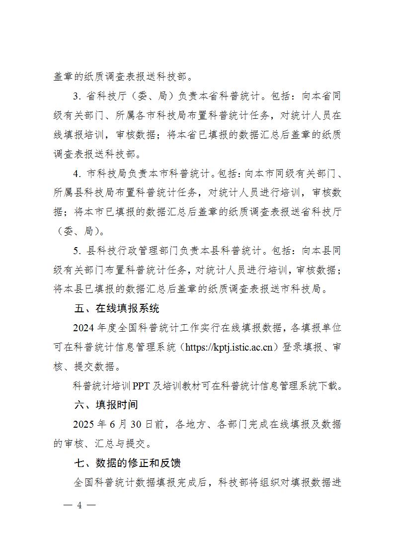 2. 请各地方、各部门于2025年6月30日前完成有关科普统计数据在线提交,将数据汇总后填写《2024年度科普统计调查表》(附件2)并将调查表逐页盖章后报送科技部九司。