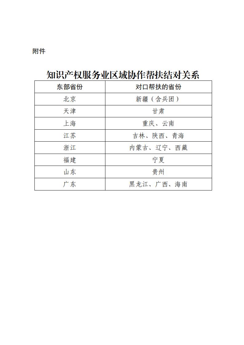 统筹确定东部8个省份(以下简称东部省份)与知识产权服务机构数量较少、基础薄弱的西部11个省份、东北三省及海南省(以下简称对口帮扶省份)的协作帮扶结对关系(见附件)。通过3年左右的时间,建立健全知识产权服务业区域协作帮扶工作机制,为西部地区、东北地区和海南自由贸易港培养一批高端专利商标代理人才,带动新兴业态、高端领域知识产权服务业发展,提升知识产权服务能力和水平,更好满足产业创新发展需求,逐步形成知识产权服务业区域协调发展的良好格局,为国家重大区域战略实施提供有力支撑。