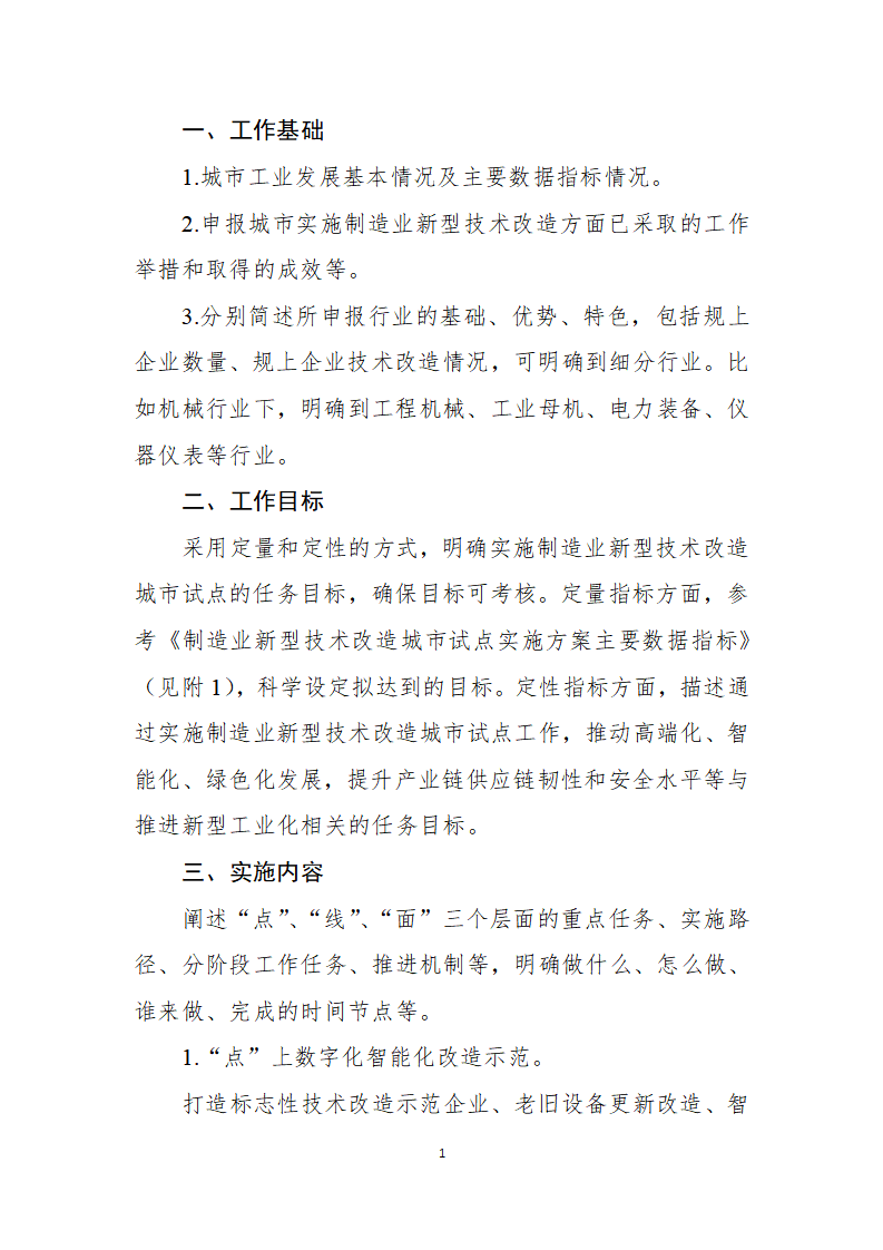 (一)聚焦重点行业。申报城市应在制造业中确定3个左右主导行业作为技术改造重点行业,鼓励选择对工业经济增长贡献度较大、转型升级需求迫切的传统产业,如石化化工、钢铁、有色、建材、机械(仪器仪表)、食品、轻工、纺织等(见附件1),并可在重点行业中进一步确定具体细分行业。