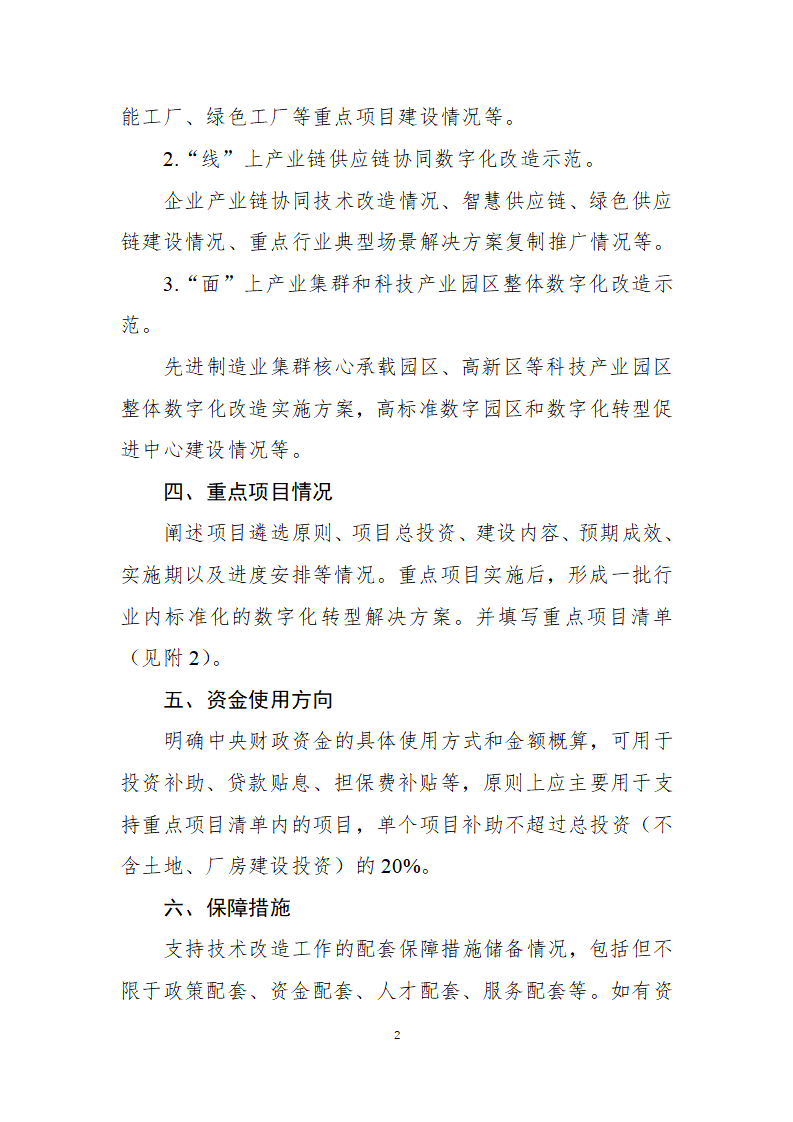 按照《通知》相关要求,继续支持城市采用“点线面”结合的方式组织示范项目,“点”上开展数字化智能化改造示范、“线”上开展产业链供应链数字化协同改造示范、“面”上开展产业集群及科技产业园区整体数字化改造示范,加快数字技术、绿色技术以及创新产品推广应用,推动制造业高端化、智能化、绿色化发展。在《通知》明确的支持内容基础上,进一步探索支持以下事项。
