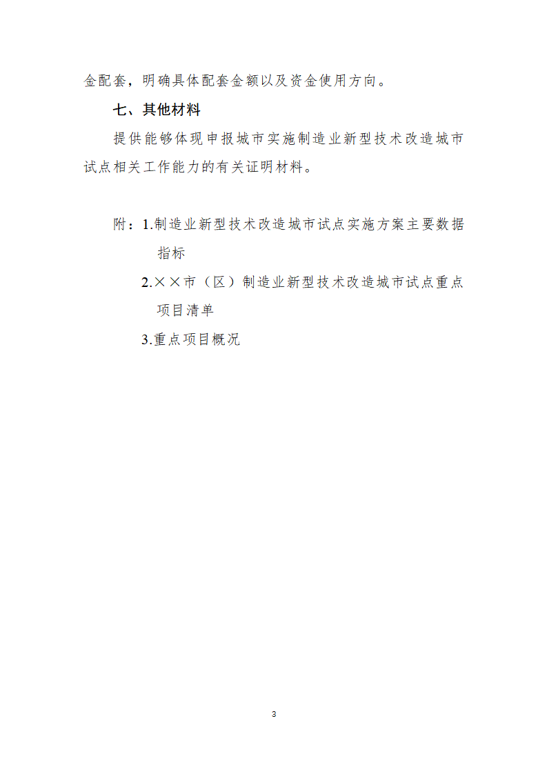 (三)加强工作衔接。鼓励第二批申报城市实施方案与首批入选城市实施方案做好衔接,在重点行业、重大项目上实施协同改造。支持先进制造业集群的牵头城市推动开展跨区域联合技改项目,推动一体部署、系统推进、协同改造。支持同一产业链上不同省份的申报城市各自在实施方案中加强衔接,放大试点城市对所处区域的辐射带动作用。