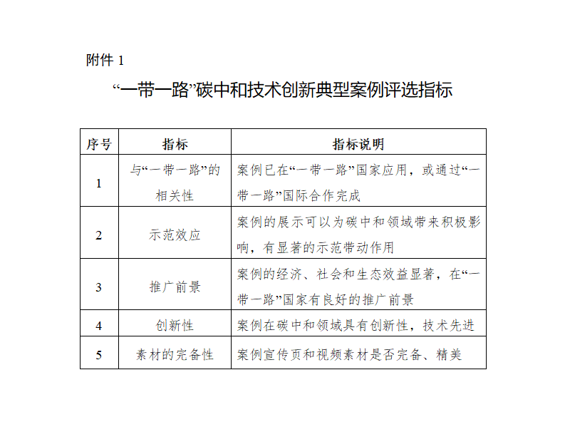 2. 每个申报依托单位限报送案例1个,申报案例完成时间应为近三年,并已取得良好实质性成效。提供的案例要具备创新性、示范效应、推广前景好,具有显著减排效应,符合“一带一路”国家的产业政策、标准和相关法律,契合“一带一路”国家可持续发展需求。案例评选指标附后(见附件1)。