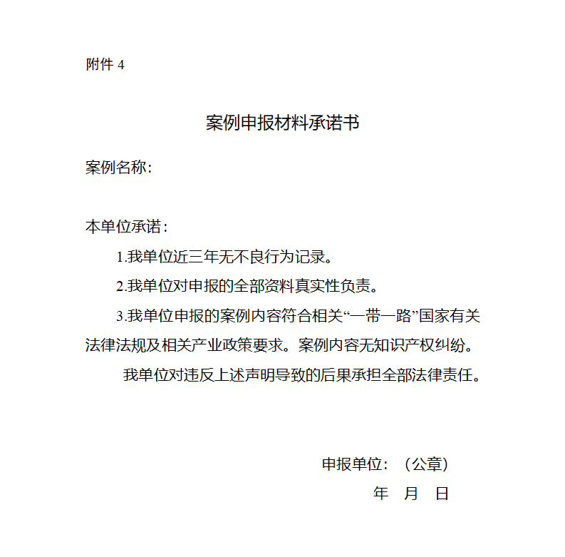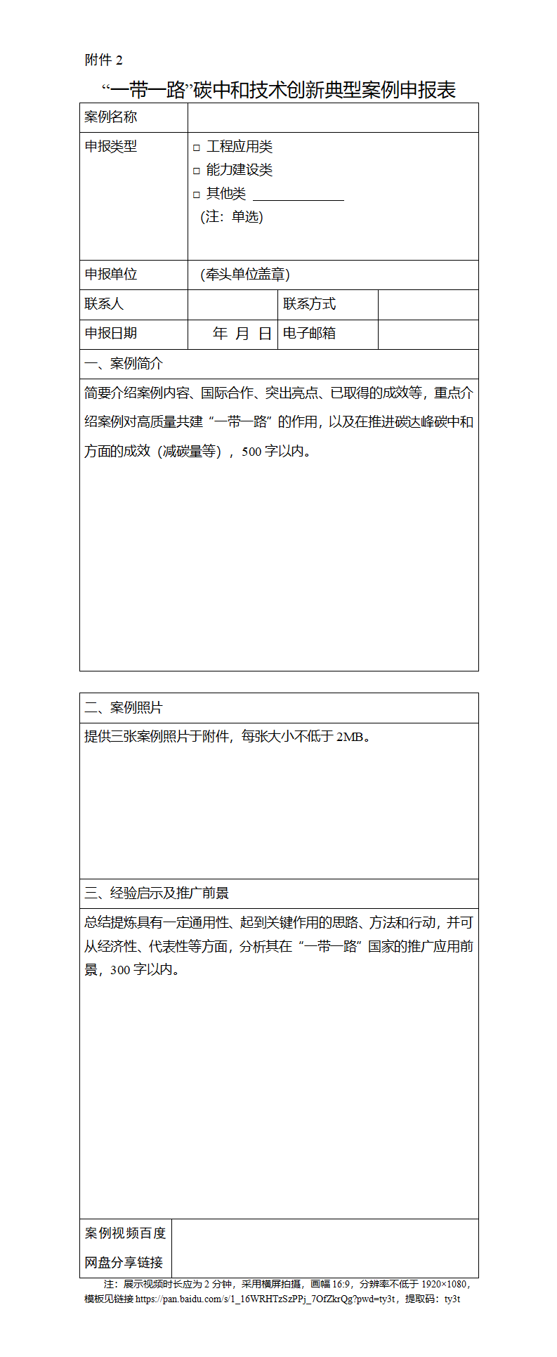 3. 申报依托单位填报《“一带一路”碳中和技术创新典型案例申报表》(附件2),并加盖依托单位公章。同时应提供案例展示视频和宣传页,以编制案例发布视频或手册。视频参考模板(见附件2注释链接);案例宣传页(参考模板见附件3)。