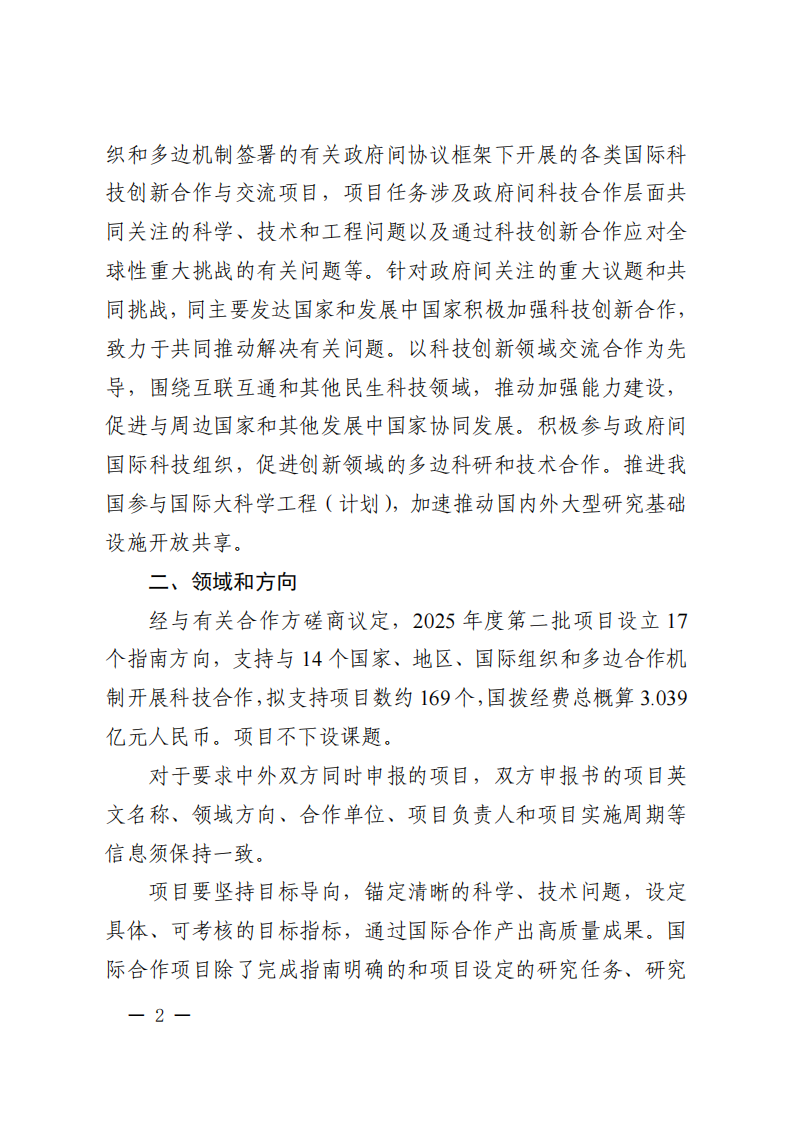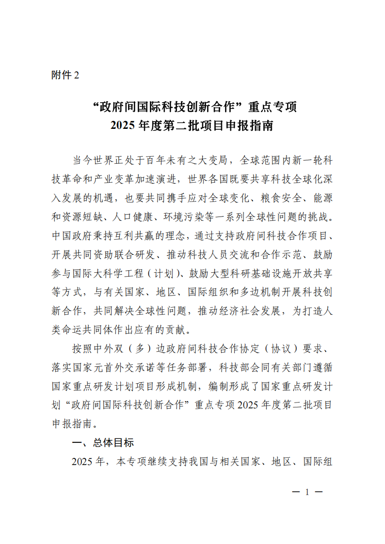 根据《国家重点研发计划管理暂行办法》(国科发资〔2024〕28号)相关要求,现发布“政府间国际科技创新合作”重点专项2025年度第二批项目申报指南。请根据指南要求组织项目申报工作。有关事项通知如下。